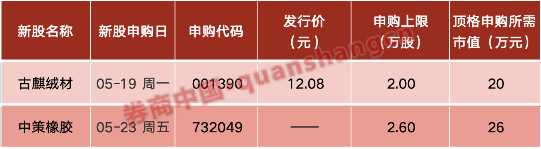 本周(5月19日—5月23日)有2只新股发行。周一:古麒绒材;周五:中策橡胶。