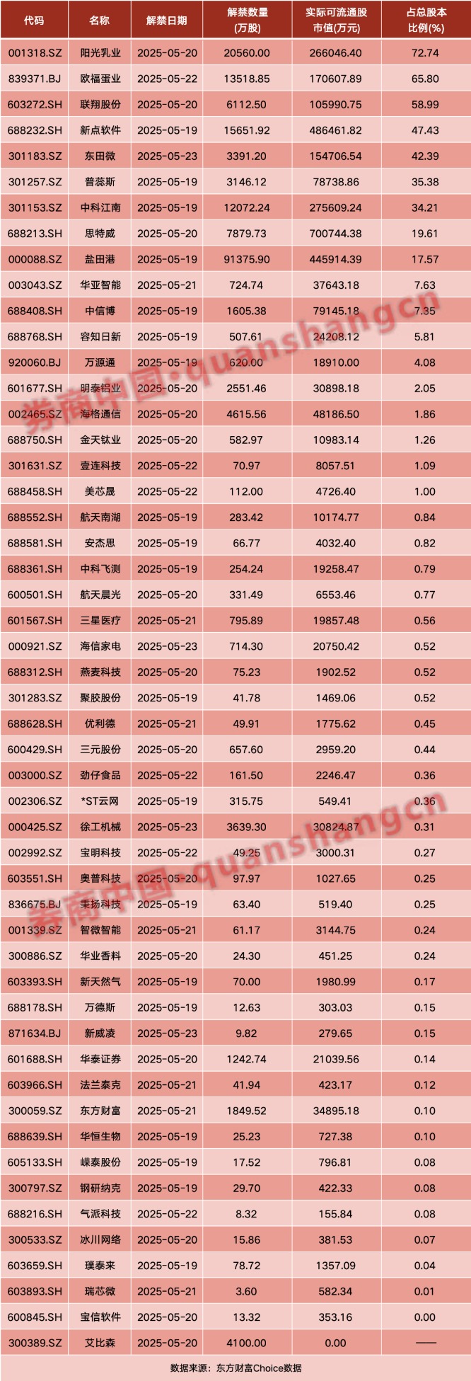 数据显示,本周(5月19日—5月23日)共有51家公司限售股陆续解禁,合计解禁量20.03亿股,按最新收盘价计算,解禁市值为314.18亿元。