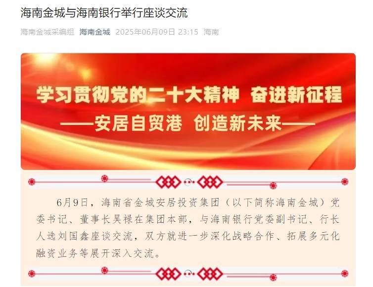 据公众号“海南金城”官方消息,日前,海南省金城安居投资集团(以下简称“海南金城”)党委书记、董事长吴禄在集团本部线上配资公司,与海南银行党委副书记、行长人选刘国鑫座谈交流,双方就进一步深化战略合作、拓展多元化融资业务等展开深入交流。